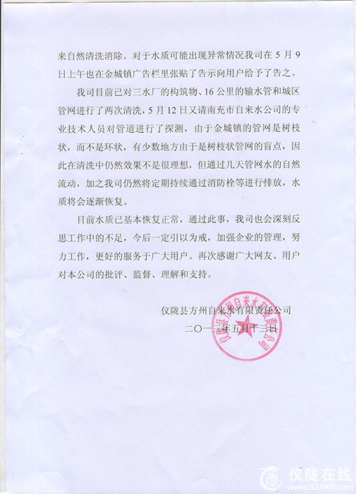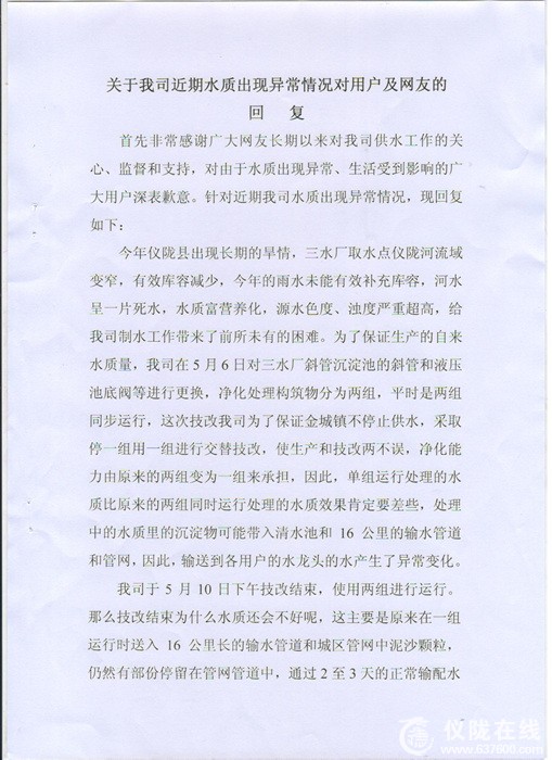 仪陇县方州自来水公司关于“金城镇水质出现异常情况”的回复: