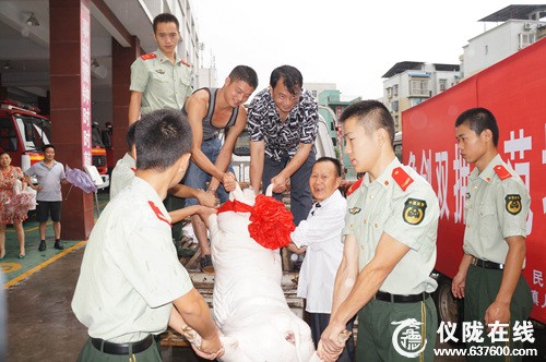 同庆光辉节日,共话军地情谊。8月1日清晨,四川省仪陇县新政镇人民政府主要负责人带着全镇人民对子弟兵的深情厚谊,冒雨慰问了驻仪武警、公安消防和县人武部官兵,向他们致以节日的问候和祝福,并送上大肥猪、土鸡、大米、食用油、蔬菜和消暑饮品等慰问物品,以此感谢驻仪武警、公安消防和县人武部官兵在维护社会稳定、服务地方发展和经济建设中所作出的贡献,深切表达了地方对部队的拥军之意、爱军之情。