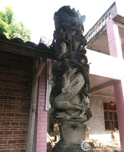 笔者看到,“盘龙石柱”的瓶座呈八棱高足敞口形,高1.5米,瓶口上端的盘龙等雕刻以圆雕为主,再配以浮雕、镂空雕刻等技法,工艺精湛,极为罕见。石柱周围饰以彩云,神像错落间杂其间,中间为一根与瓶口直径相等的圆柱。