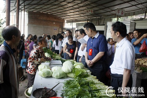 在大寅综合市场,视察组与卖菜的农民亲切交谈,了解农贸市场带给群众的好处以及群众对市场管理工作的要求。