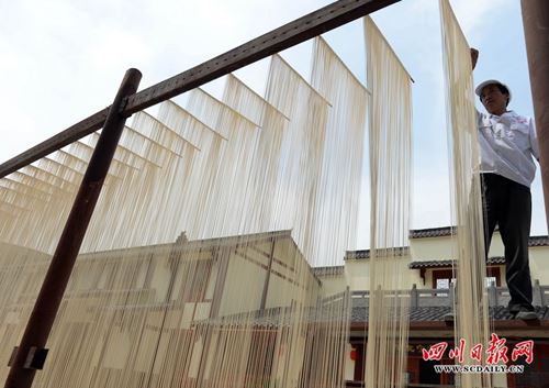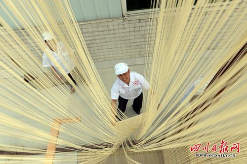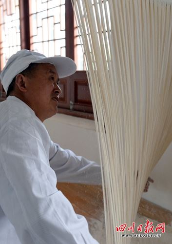 “川北客家”手工面的制作十分考究,从50斤的面到拉成200多米长的小条,再拉伸到4米长的单根面条,需经过和面、起桶、开条、拉大条、拉小条、搓面上竹、抻面、扑面分面、拉面、上架晾面、分面晾晒、收面包装等十二道工序,需要18个小时左右才能完成,且根根面条细如丝,丝丝空心。
