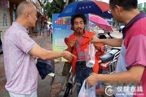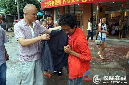 图为8月29日,仪陇县救助站工作人员正在街头对一流浪乞讨人员提供饮食、衣被等救助。