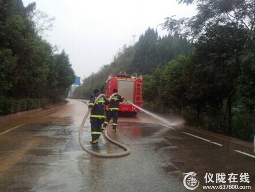 9时45分,县消防中队派一辆消防车和4名消防官兵赶赴现场,开展清洗工作。经过2个多小时的联合作战,道路上的泥泞终于被完全清除。