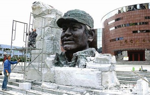 “力争下周修饰完毕。”一位工作人员告诉记者,张思德同志塑像由铜制人物头像造型、山石造型和基座3部分组成。基座高0.6米;山石造型所用材料为泰山石,上书“为人民服务”5个大字,高4.4米。人物头像造型高2.9米。