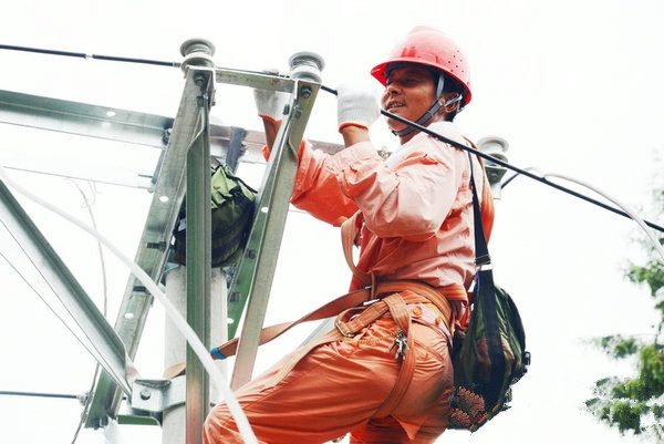 记者走进海拨较高的高岩口村,6名电力工人正顶着烈日施工。身上的红色工装被嗮成了粉白色,湿透了;脸嗮成了古铜色,豆大的汗珠密布脸颊上;他们正在电线杆上加紧铺设线路。