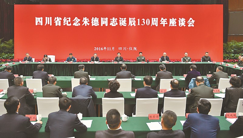 在下午举行的四川省纪念朱德同志诞辰130周年座谈会上,省人大常委会党组书记、副主任陈光志,省军区司令员姜永申,省委党史研究室副主任李仁,南充市委书记宋朝华,朱德同志亲属代表赵力平分别发言,从不同侧面深情回顾了朱德同志为民族独立、人民解放和国家富强、人民幸福建立的历史功勋,追思和学习朱德同志为党和人民事业不懈奋斗、鞠躬尽瘁的高尚风范,表达对朱德同志的无限敬仰、深切怀念以及齐心协力建设好朱德同志家乡的坚定决心。