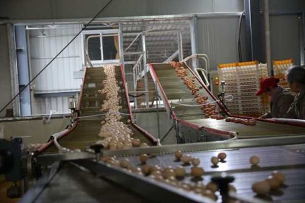 走进养殖园,记者看到,“搭乘”着自动化生产线,一只只鸡蛋从蛋鸡养殖区内传送出来,园区内干净整洁。“这一整套设备都是从德国引进的。”养殖园相关负责人介绍,蛋鸡养殖区内没有工人,“都是自动给食、自动捡蛋、自动除粪、自动检测。”