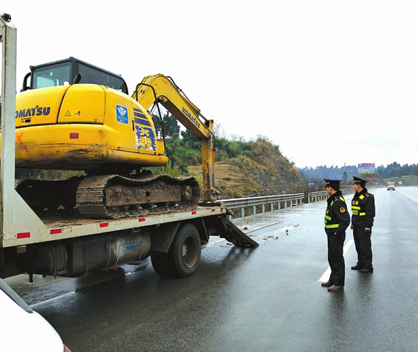 近日,仪陇县路政大队巡查三中队巡查至G85马鞍高速公路连接线席安村段时,发现一辆轻型履带式挖掘机正在公路上行驶。执法人员及时有效处理,消除了公路安全隐患,保障了路容路貌整洁和美观。