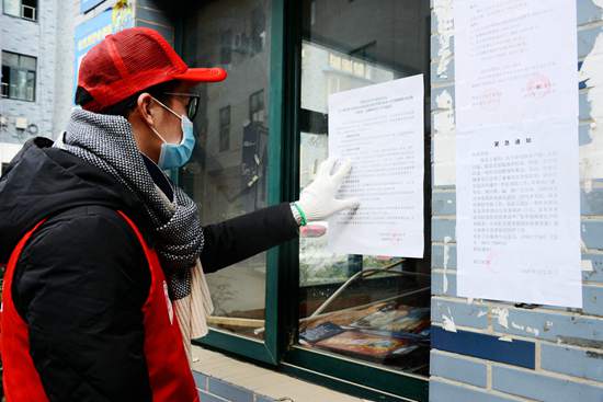 | 2月3日,德乡志愿者在张贴关于抗击疫情的告知书 |