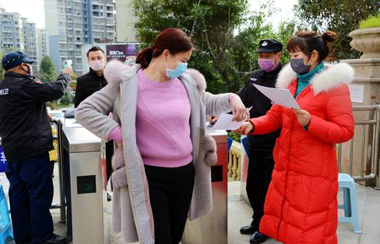 | 2月4日,仪陇县新政镇壹号公馆小区门口,物业管理员为居民发放抗击疫情告知书 |