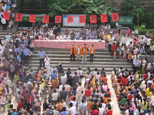 6月18日上午9点,仪陇县人民法院在合作小学举行了对王林等四名犯罪人员的公开宣判大会,并宣读了一审判决书。2007年冬,王林涉嫌对合作小学初三学生邓某进行敲诈勒索,校领导进行干涉后,王林遂纠集社会闲散人员进行报复,将学校领导殴打致伤。这在社会上造成了极其恶劣的影响。
