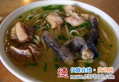 不一会儿,厨房的伙计就端出两碗热腾腾的面条,面条的上面是绿绿的葱花和已经被炖得醇香入味的鸡块,鸡汤掩住了大部分面条。远远的就能闻见农家土鸡的香味。汤汁是经过炖鸡面店老板的秘制的,不黏稠的汤汁有些清澈,味道十分爽口,轻轻咽下,感觉是淡淡的香味沁入到整个身体。面条似乎也被炖的汤汁也吸入一样,变得如鸡汤般的香靓。面条是店里伙计自己手工碾制的,不硬不软面条一点也不会影响汤、肉、面的融合。