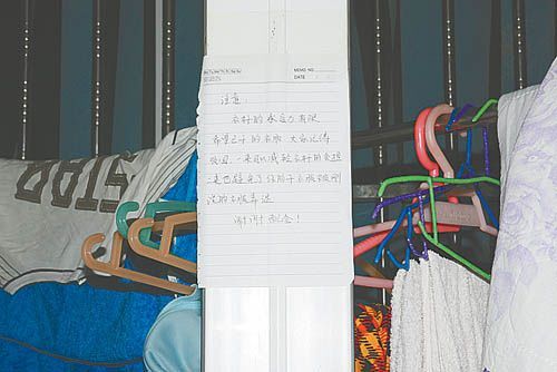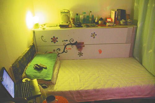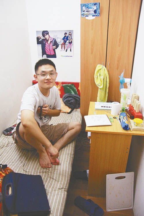 这处两居室,被分割出九间小隔断房。每小间都是用三合板隔断,只有四间有窗户,其他小间里只能放下一张单人床和一张小桌、一个柜子。卫生间是公用的,遇到高峰时大家就得抢着用了。因为人很多,卫生间下水经常被堵,地面上也都是脚印,有时甚至连垃圾桶里的纸也会溢了出来。幸亏房里住着两位勤快的女士马大姐和小刘,否则真不敢想象里面会成什么样子。为了节省空间,小间的房门也是专门定做的,通常要比正常的房门小点。即使这样,门还是经常堵住大家的路。厨房是公用的,由于没有客厅,通常吃饭只能站着,或是在自己小屋的床上搭一张小桌。人要多点,房间里还真没有落脚的地方。