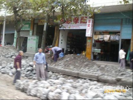 图为老县城建设路破损地段已被刨开,工人正在进行手摆片石奠基