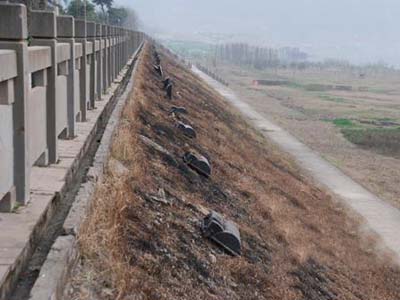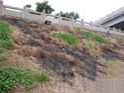 当我们还沉浸在喜悦之中时,不幸的事却已发生。笔者沿着大道逛了一圈,看到路边不少地方“冒”出了成片的绿阴,远处的河滩湿地公园内正透着春的气息,再往栏杆下一瞧,一块绿,一块黄,还有一块黑的?黑漆漆的下面显露出光秃秃的地表和被火烧过的彩光灯盒子,有的地方甚至是一整片的植被和彩光灯被烧掉,千疮百孔、惨不忍睹。不知是有人故意放火为之,还是无知玩童玩火造成,相关部门可有去查看过?