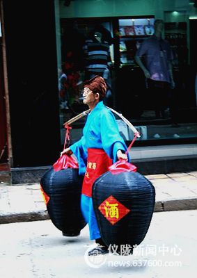 本站讯(吴文东 杨普光)临近8月,生意场上历来的淡季也悄然而至。一般这个时候商家大多选择出门旅游、降价吆喝等措施。但在我县金城镇却有某商家利用传统汉文化做广告,为自己的商品做宣传。几个身着传统汉服的老者,挑着几缸酒沿街叫卖。还不时放着有中国特色的《红高粱》插曲。别样新意广告引得路人驻足观看,也为商家自己赚取了眼球。