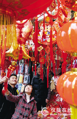 1月15日,在复兴镇的大集上农民朋友正在购置灯笼、中国结等喜庆物品。