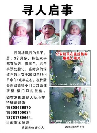 8月4日下午,仪陇县新政镇商贸街发生一起丢失男婴案件,一名年仅3个月大的男婴雨雨在自家楼下被人抱走。警方和雨雨的家人四处寻人,最终获得一条重要线索:事发时曾有一名约60岁的老年男子抱着一名婴儿离去,附近超市监控录像拍下了他抱着婴儿慌张离去的情景。截止昨日,警方正在追踪那名嫌疑人。