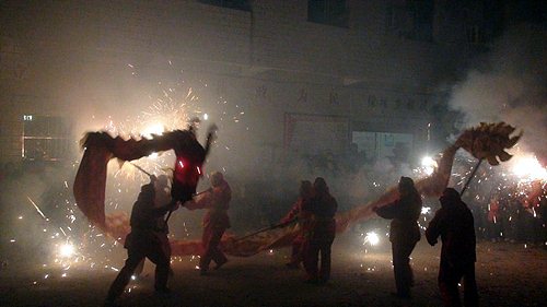 晚上七点,闹元宵活动正式开始,整个场镇火树银花、彩灯闪烁、礼花飞舞;乐鼓声、爆竹声、吆喝声交织在一起;礼花当空照,蛟龙穿云吐雾;车如流、人如潮,到处都是欢乐的海洋,人们欣赏着这里美丽的夜色、感受着这里特有的民俗文化。