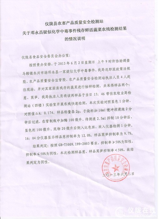 经调查发现,事发地位于马鞍镇农贸市场内一居民家中,户主邓某,男,42岁,马鞍镇石坝村人;其妻彭某,42岁,另有两个女儿(一个6岁,一个3岁)。邓某一家平时以经营卤菜为生。6月1日中午及晚上,邓某一家四口接连食用新上市的萝卜苗;半夜后,彭某说身体不舒服,但未引起邓某重视。6月2日早上,邓某醒来发现自己躺在地上,其妻已死亡,两个女儿均呕吐昏迷。随即,邓某拨打电话进行求救,我县第二人民医院第一时间赶到,及时对邓某及其两个女儿实施抢救并转入医院治疗。经我县第二人民医院抢救未见明显好转,随后及时转入县人民医院救治。县疾控中心第一时间对其大女儿的洗胃液进行了化学分析,发现亚硝酸盐达到了1.00mg/L,县农牧业局的农药残留快速检测未发现菜品农药残留超标;据此,县医院根据检测结果,有针对性制定了治疗方案,经医院的全力抢救后,邓某及其二女儿脱离生命危险。目前,邓某本人及其小女儿均在县人民医院接受进一步治疗,病情稳定,各项生理指标正常,生命体征平稳,均已进食。