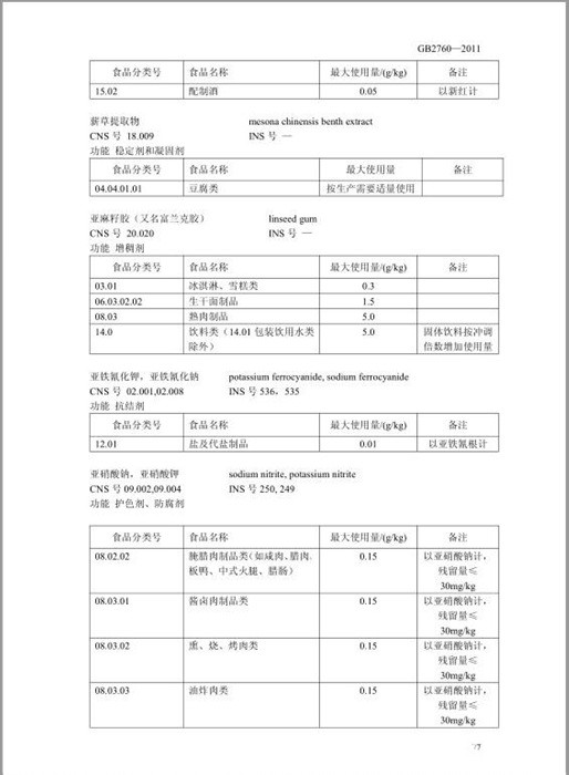 国家标准:根据国家《食品添加剂使用标准》(GB2760—2011)规定,亚硝酸盐作为护色剂、防腐剂,允许在部分肉制品(如腌腊肉制品、酱卤肉制品、熏烧烤肉类、油炸肉类、火腿、肉灌肠、发酵肉制品类、肉罐头类)使用,但均不得超过0.15g/kg的国家标准。
