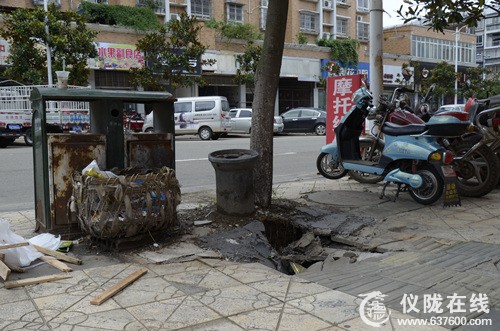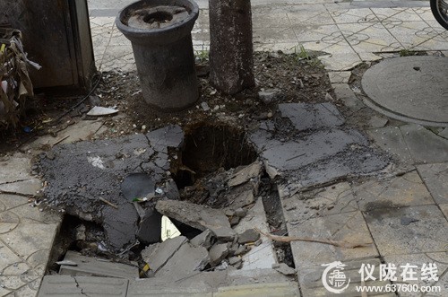 7月3日中午,仪陇在线笔者看来到仪陇锦绣路江岸名苑大门口处,看到人行道行道树旁现出了一个洞,这个塌陷的洞,刚好在盲道 旁边,下陷的面积有二三平方米,一颗行道树露出一些树根,而洞口附近没有任何警示标志,过往行人、车辆不得不小心翼翼。