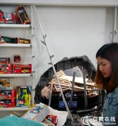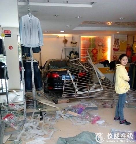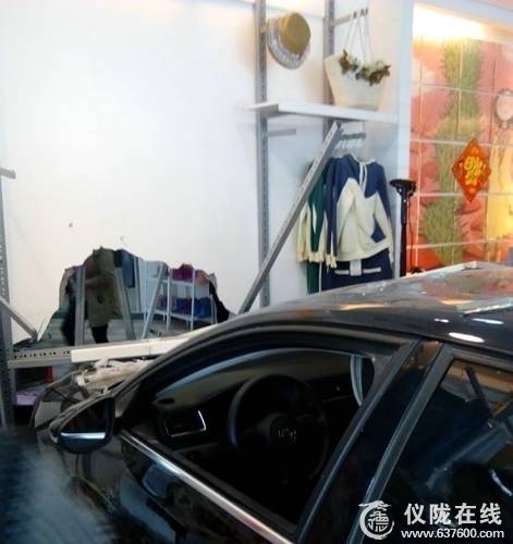 事发时,这辆牌号为川R 9A的大众轿车停在万德百姓超市门口,不知道为什么冲进了店铺,轿车一头钻进了琳琅大道阿尔玛服装店。