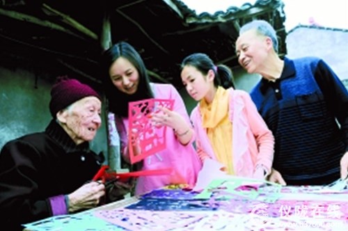 10月12日,记者在仪陇县永光乡南天村村民胡显珍家看到,现年101岁的胡显珍老人正向72岁的大儿子何树立、35岁的孙媳妇毛小玲、12岁的重孙女何香仪传授剪纸技艺。