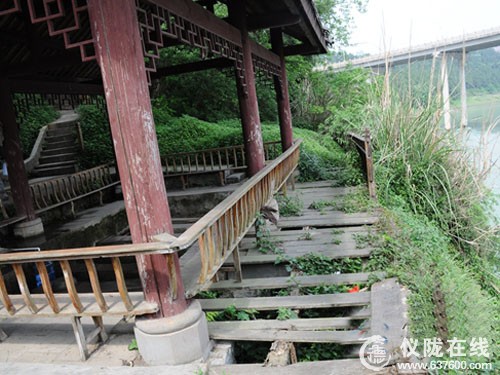 记者来到离堆公园看到,发现确实有不少地方的护栏损坏。在靠近江边的一凉亭处看到,凉亭外的护栏和铺设的木条地板已严重腐蚀,部分木条地板已不知去处,市民根本不敢靠近护栏,在护栏上还有县文管所提醒注意安全的“此处危险,请勿靠近”警示牌。沿着凉亭往前走到一庙宇外看到,原本由木质材料做成的护栏和过道,由于自然等原因损毁特别严重,过往市民只能小心靠近庙宇一边而过,真怕一不小心掉到江里。