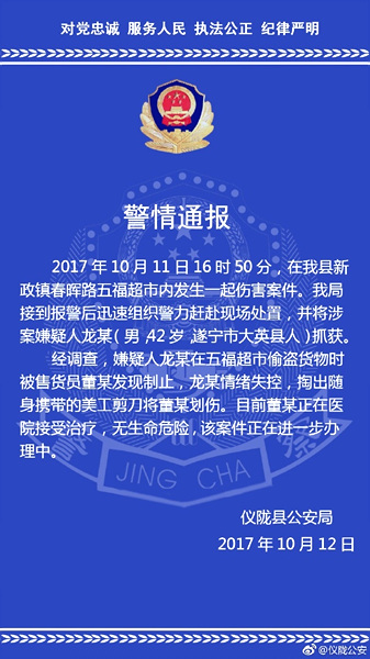 2017年10月11日16时50分,在我县新政镇春晖路五福超市内发生一起伤害案件。我局接到报警后迅速组织警力赶赴现场处置,并将涉案嫌疑人龙某( 男42 岁遂宁市大英县人)抓获。