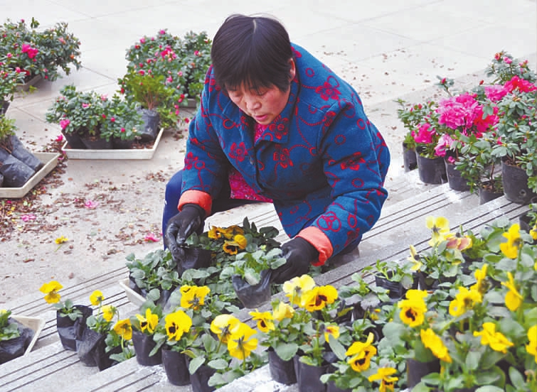 2月2日,记者在仪陇县行政中心广场看到,近20名工人正在忙碌地摆放盆花。蝴蝶花、报春花、瓜叶菊摆满了广场五角星花池、梯步、花钵、花箱等地方。