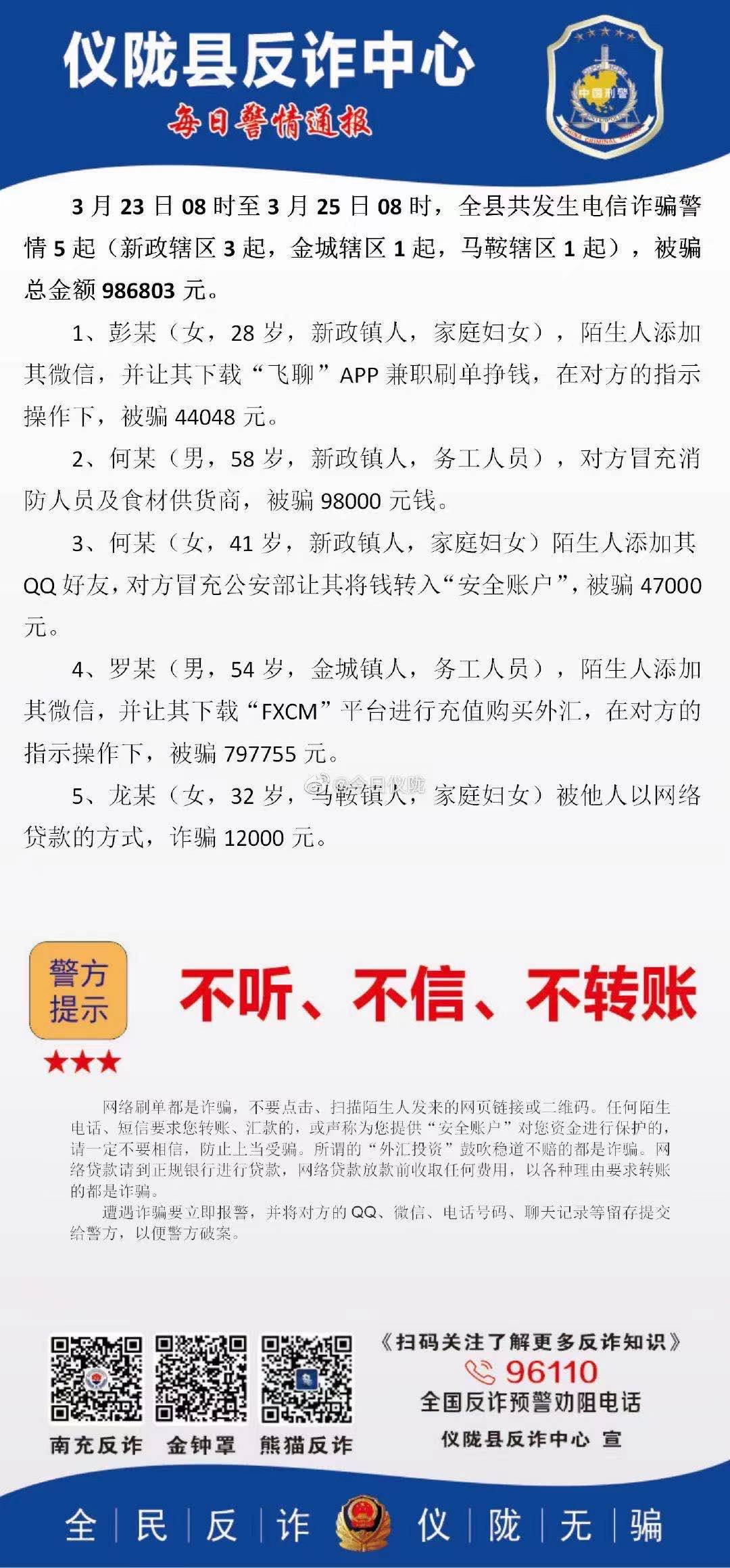 3月23日08时至3月25日08时,全县共发生电信诈骗警情5起(新政辖区3起,金城辖区1起,马鞍辖区1起),被骗总金额986803元。