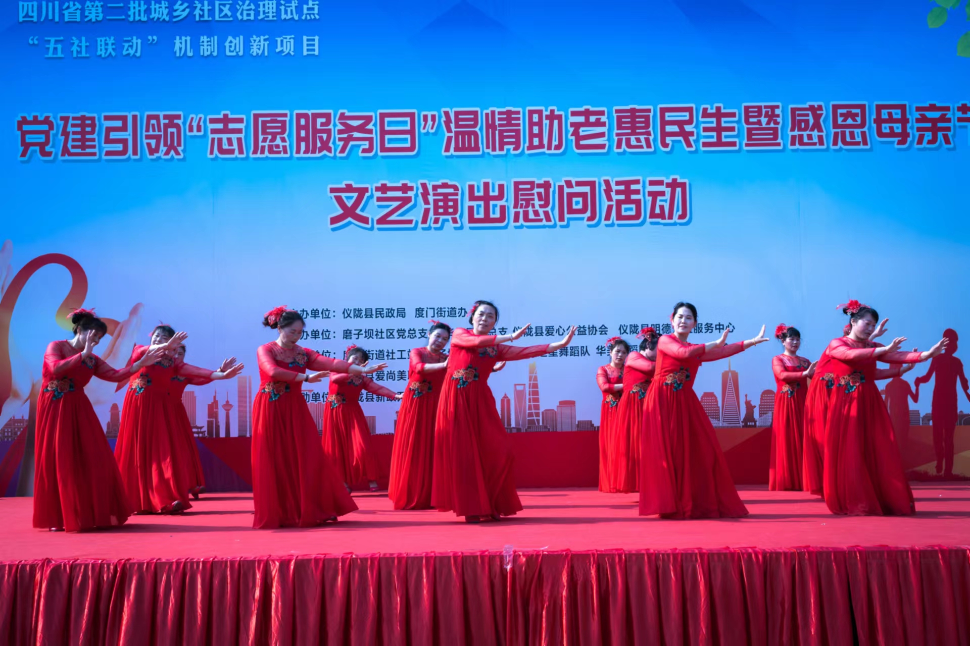 5月8日,仪陇县民政局、度门街道办、度门街道社工站、磨子坝社区、县爱心公益协会、县明德公益服务中心携手磨子坝社区军鼓队、浪漫之星舞蹈队、华美舞蹈队,仪陇县摄影家协会联合举办的 “党建引领·‘志愿服务日’·温情助老惠民生暨感恩母亲节“文艺演出在磨子坝社区文化广场暖心上演。