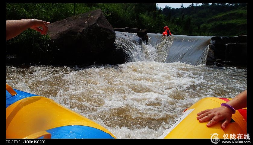 还没下水,一些同志们就按捺不住了,已经在互相泼水湿身。最前面的几个险滩,玩的就是心跳,皮筏字在工作人员的勾引下,嗖嗖的就下去了,一阵呜哩哇啦的尖叫声,人在哪里?橡皮筏子在哪里?把人都搞懵了。还有的下去就给弄了个底朝天,会水的就跑了,不会水的一阵扑腾,赶忙翻身去找皮筏子,啥子头盔等都不见了,好在没给飞到乱石堆里,那就要了亲小命了。还有的直呼不漂了,给吓倒了。回来后一统计,我们驴友翻船的还不少,呵呵,都是有惊无险。还有一猛女,男人在船上稳稳当当躺着,她在水里使劲地推啊推、拉啊拉、游啊游,谁让她会水呢?还有的,男人小孩和船都冲下去了,她却还在两个石墩中间卡着,好不容易才拔出来。