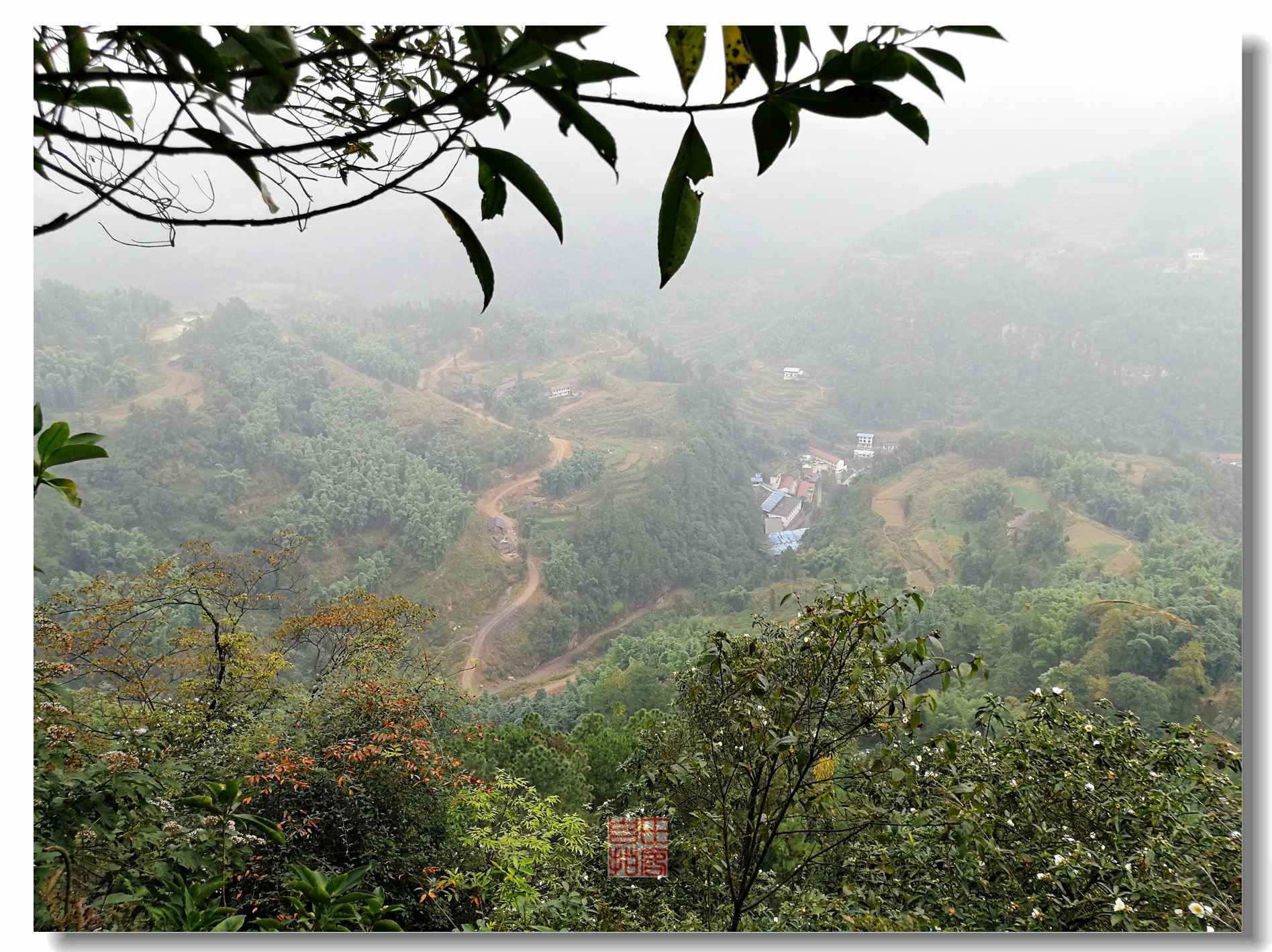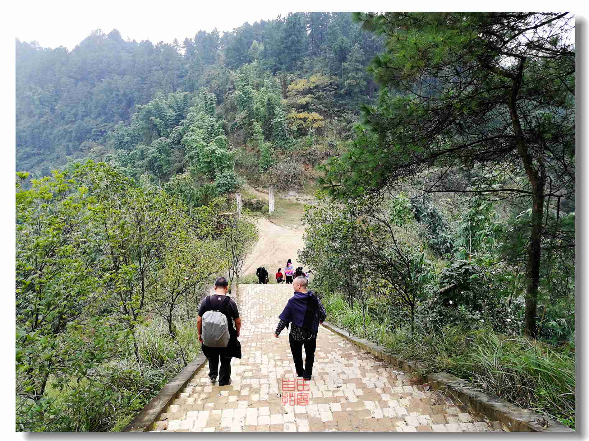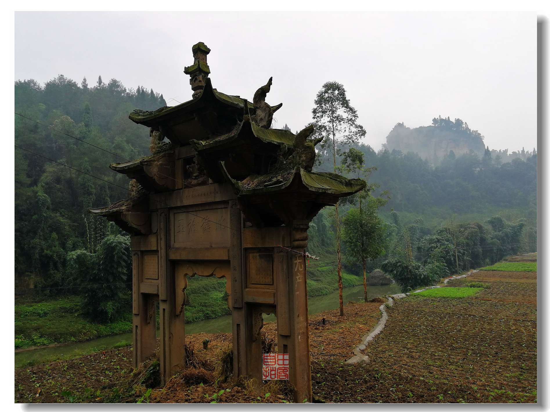 10.28上午,任雨飘洒,俺们一行从威远骑龙坳往连界,即著名的川威集团所在地,有煤有钢铁,只是到处黑黢麻空的,城边一条公路都被重车压塌了。环境和发展,但愿能和谐共存。我们这两个小轿底盘矮,绕了3圈终于找到往俩母山的路。一路风景清秀自然,颇有川南水乡的韵味。路边小河沟发现有一牌坊,还很有气势,肯定有些来历,可惜辉煌不再。周围的地都被开垦了,看来还是缺少保护哈。