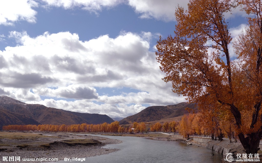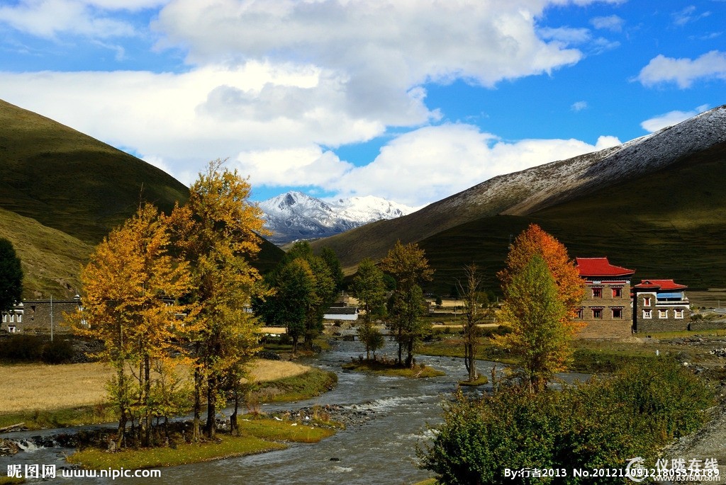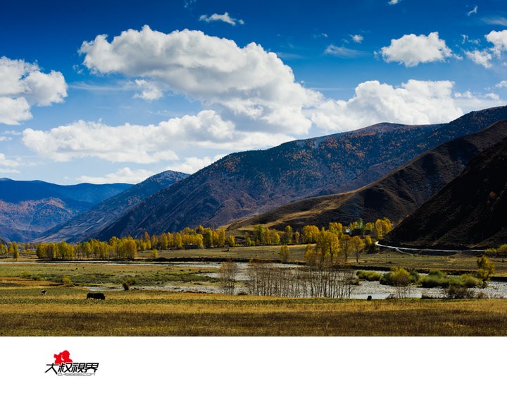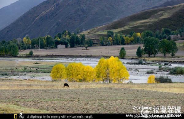 新都桥镇又叫东俄罗,海拔3300米左右,高原气候,温差较大,气候多变,初次上高原的朋友可能有不同程度的高原反应。它是川藏线南北分叉路口,北通甘孜、南接理塘,是从西藏通往康定的必经之路。距离成都437公里,距离康定城80公里,途中要翻越海拔4298米的折多山,可远眺蜀山之王——贡嘎山。沿着川藏公路南线前行,只见一个个典型的藏族村落依山傍水地散布在公路两旁,一条浅浅的小河与公路相依相偎地蜿蜒流淌。房前路旁矗立着一棵棵挺拔的白杨,在秋风秋阳中炫耀着特有的金黄。一群群的牦牛和山羊,点缀在新都桥田园牧歌式的图画中,平添出许多生动。远处的山脊,舒缓地在天幕上划出一道道优美的弧线