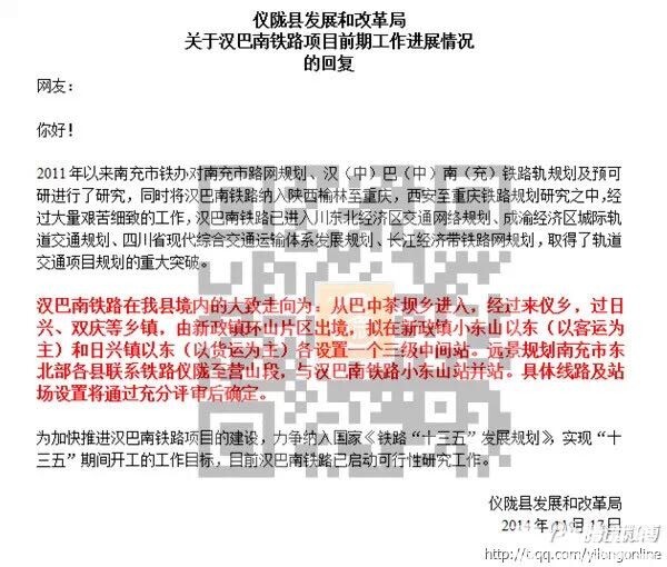 【仪陇县发展和改革局:关于汉巴南铁路项目前期工作进展情况的回复】仪陇的网友们,有多远就转多远吧!!我们用回复数据说话,仪陇的大喜事了,还在说仪陇没有铁路吗?目前已启动可行性研究工作,仪友们,通过我