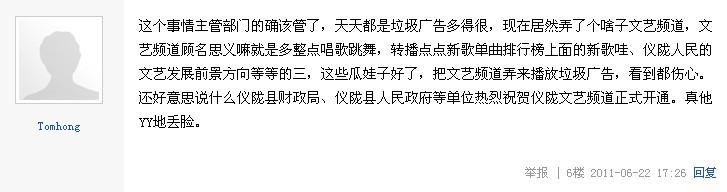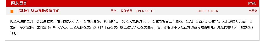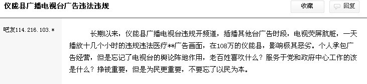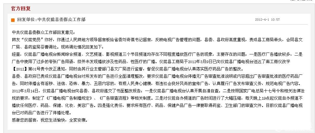 发现问题并解决问题是我党工作中最重要的一种提升自我的方式。仪陇电视台出现的这些问题久久得不到解决,污染了广大仪陇群众的双眼和思想,从电视中得不到实质性有用的信息。那些充斥的虚假药品广告不仅危害了患者的生命安全,还影响了仪陇的形象,也让老百姓对本地政治、经济、文化等方面信息知之甚少。地方电视台出现这种情况不可避免,但若能从仪陇做起,适可而止,相信能还仪陇百姓一块明净的电视天空。也请有良知、有正义感的群众列举仪陇电视台更多的违法行为!还望电视台及相关部门彻查,给老百姓一个满意的答复!如若没有整改,本人将以书面形式向中、省、市相关部门举报!