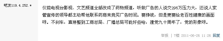 三、仪陇电视台新闻综合频道作为一个政治导向频道,没发挥其传播新闻、贴近生活的功用,反之广告时间过长,电视剧中插播广告长达十分钟(广电总局已明令禁止在电视剧中插播广告),广告制作粗糙,画面极其简陋,缺乏美感。作为本地最权威的频道,居然大量播出5分钟的医院广告,采用假专家、假讲座、误导群众。游动字幕过多,文字过大,遮住了电视剧字幕,导致电视剧不能正常观看。