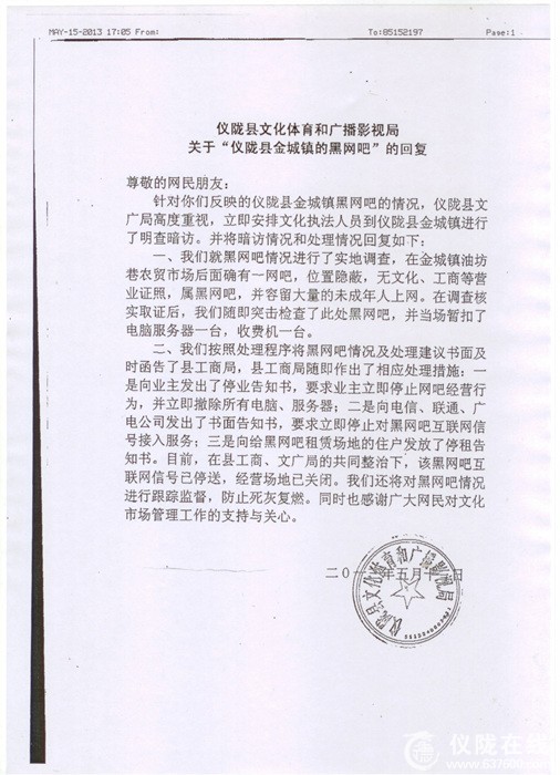 仪陇县文化体育和广播影视局关于“仪陇县金城镇黑网吧”的回复