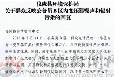我是8月12日(星期一)9:00—11:00期间打了6个仪陇县环保局办公室电话反映情况,办公室人员最后告诉我说负责人不在,喊我直接给环保局一廖姓负责人打电话:13808278258,于是我又只好打给廖负责人,廖说他下午来看,于是我在家等了一下午,第二天又在家苦苦恭候一天,期间没有任何人给我来电,直到8月14日上午,廖负责人给我来电说过来看看情况,我小心翼翼,满是欠意地在外面等候他们(因为觉得自己的事给公家添了麻烦).环保局的人来了,我立马说:给你们打麻烦了,廖负责人一脸严肃与不悦,叫一位年青人进入我家到窗户上测了噪音,当时噪音值是50多分贝,我向年青人反映我家的电脑被磁化,叫他看看,年青人没有作出回答。廖负责人说:噪音值50多是正常的(而国家规定值是50分贝以下),白天有其它噪音干扰,晚上再来测;廖负责人对于我当时反映的电磁干扰问题说他也不是很清楚,要回去翻一下资料,翻到资料立马给我们答复。从8月14日上午他们离开后就没有任何音讯.而我和家人从8月14开始每天晚上都在家苦苦等候环保局来测噪音,又生怕没接到电话,做饭都把手机放在厨房里面。这期间环保局没有任何人给我们电话告之:来与不来或什么时候来,当然也就没有他所说的“翻到资料立马给我们答复”.我们把他们的一句话铭记在心,天天盼,天天等呀.在苦苦等候几天无果的情况下,是不是环保局的负责人早就把此事忘记了,我不得已于8月19日将此事反映到仪陇新闻网,提醒环保局的帮我们解决此事。我天天关注这条新闻,希望环保局的人看到后,能给我们说说。直到8月23日环保局就我网上的贴子作了如上失真的回复。这是我打印的和环保局通话记录,请仪陇县的领导和老百姓们看看: