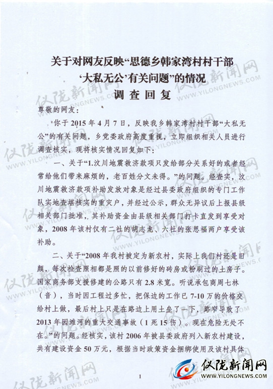 首先看了思德乡的回复内容,我笑了,思德乡政府跟韩家湾村村干部的关系就是上下级关系,也可以说是儿子跟老子的关系