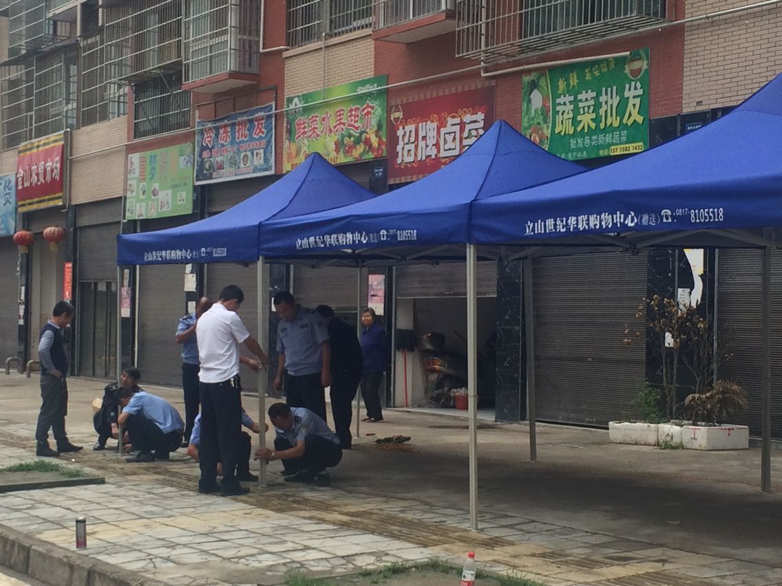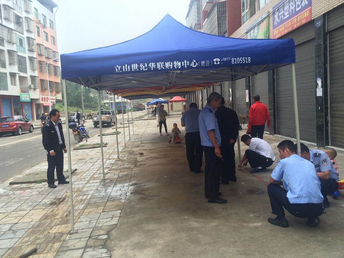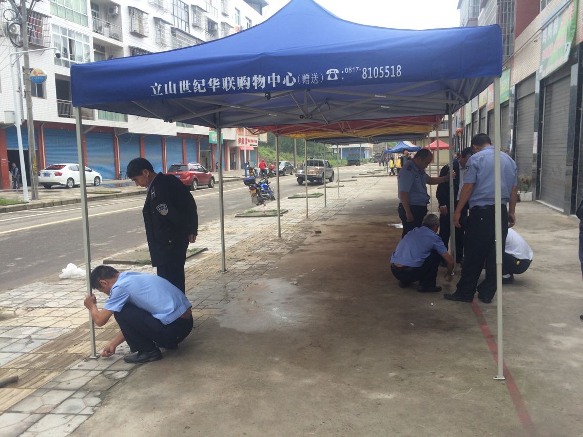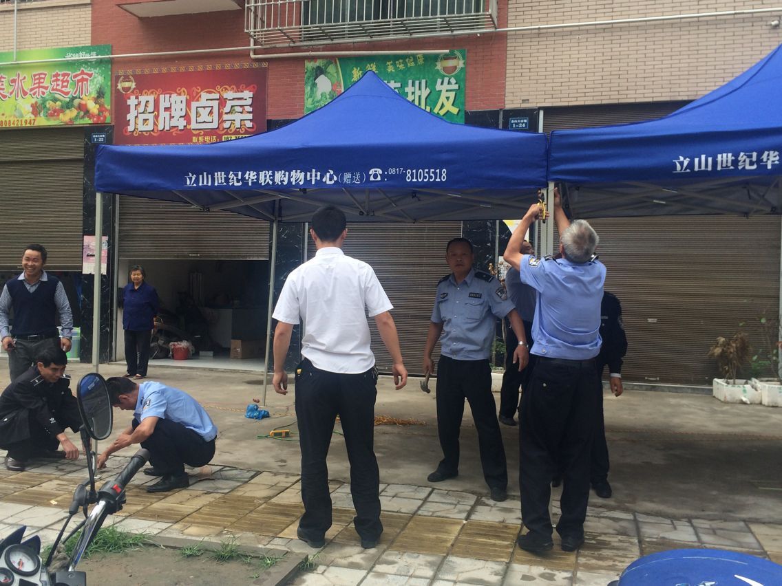 立山城镇政府,立山镇长缨社区,城镇管理工作人员,在立山金山农贸市场安装一批当地新开的世纪华联超市赠送的遮阳避雨伞,为当地菜农自主经营创造舒适的环境。