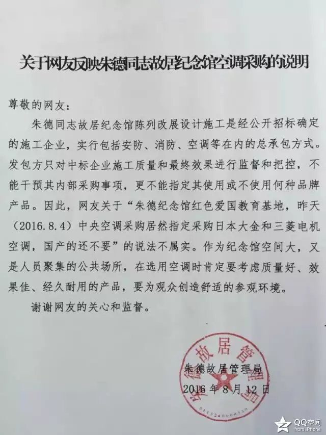 求证,南充仪陇县马鞍镇朱德纪念馆红色爱国教育基地,昨天(2016.8.4)中央空调采购居然指定采购日本大金和三菱电机空调,国产的还不要,这是给爱国教育基地的最大讽刺,朱总一生抵御外敌,抗击日寇,可后人在他130周年庆典还给日本人做这么大的贡献,我们不说价格差别,就说国内长虹、海尔、美的、格力那个不能满足他,几百万就给日企了,别的场合可以用,但这个要用到红色抗日爱国教育基地我们国人怎么想,领导是怎么想的,出于什么原则选择他!!重要是还多次招标,本来装修招标都包含空调价格了哦,内部人员又把空调再次招标 ,重大经济损失。。。。。。。