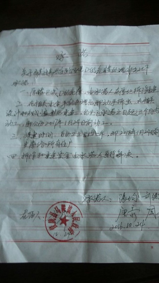 原楼已成D级危房,由承诺人在原址拆除重建,2017年1月24日前必须动工,2018年1月24日前交新房给所有住户,拆除和重建资金由承诺人自行解决。