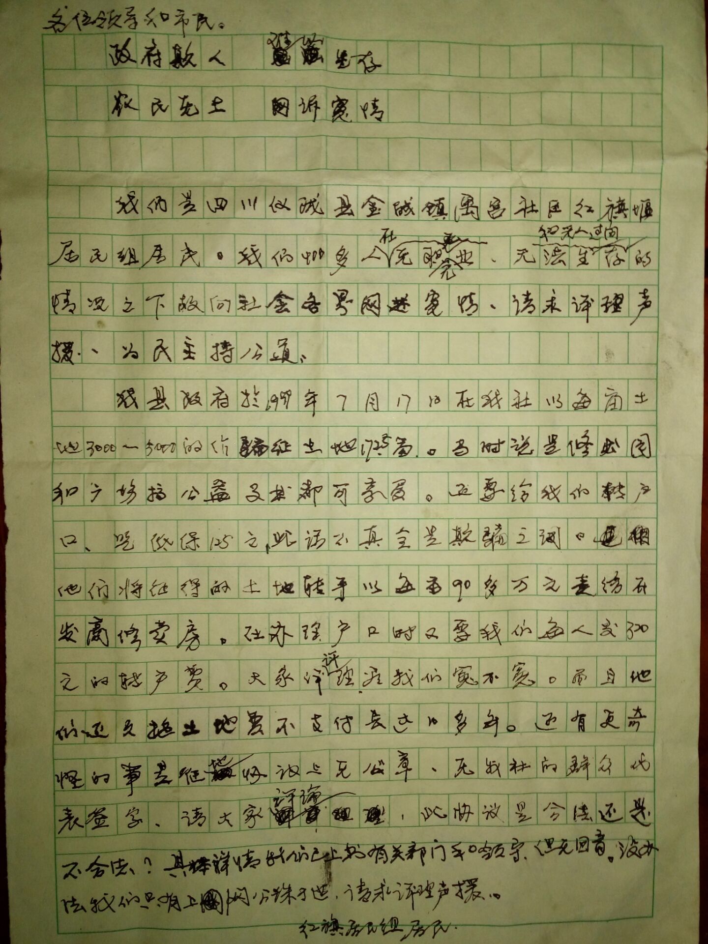 四川仪陇县金城镇禹宫社区红旗堰居民组居民呈报,我县政府于1999年7月17日在我社以每亩3000至5000元的价骗征土地172.5亩,当时政府公告征收土地用于就修建公园和广场等公益事业,我社居民依据《中华人民共和国土地管理法》第2条第4款规定以低价出让土地用于公益事业,且我社居民热心从公益事业并未对政府征收土地有过多怀疑。而政府未按照法律规定的程序征收土地,(应当事先经本集体经济组织成员的村民会议三分之二以上成员或者三分之二以上村民代表的同意,亦未在征地报批前,向市、县(市)国土资源部门就当将拟征土地的用途、位置、补偿标准、安置途径等以《征地告知书》的形式告知被征地的农村集体经济组织和农户。同时告知被征地农村集体经济组织和农户,),政府将土地作为商业用途修建金粟大酒店,后由于金粟大酒店生意惨淡。于2014年政府又将土地转让给房地产开发商修建峰景豪庭用于房地产开发。依据《我国土地管理办法》第63条规定农民集体所有的土地的使用权不得出让转让或者出租用于非农业建设,即法律禁止农民集体的土地用于房地产等非农业建设。且《中华人民共和国土地管理法》第六十五条之规定,“因撤销、迁移等原因而停止使用土地的,由农村集体经济组织报经原批准用地的人民政府批准,可以收回土地使用权。而金粟大酒店停业近五年。我社有权收回集体土地使用权。现我社居民依据国家法律要求收回用于商业建设的集体土地。并要求政府赔偿集体组织农民的相关损失。
