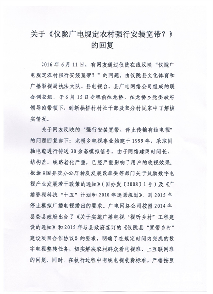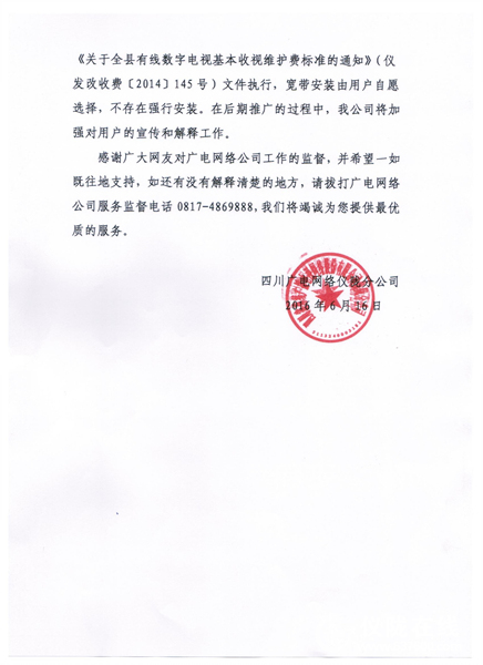 今日村干部全村广播:因为我们村是贫困村仪陇广播电视局安排工作人员前来安装宽带,从今日起全村的有线电视信号就会终止·望各位村民积极配合,准备好资金。宽带看电视每年360元!宽带上网,每月48元