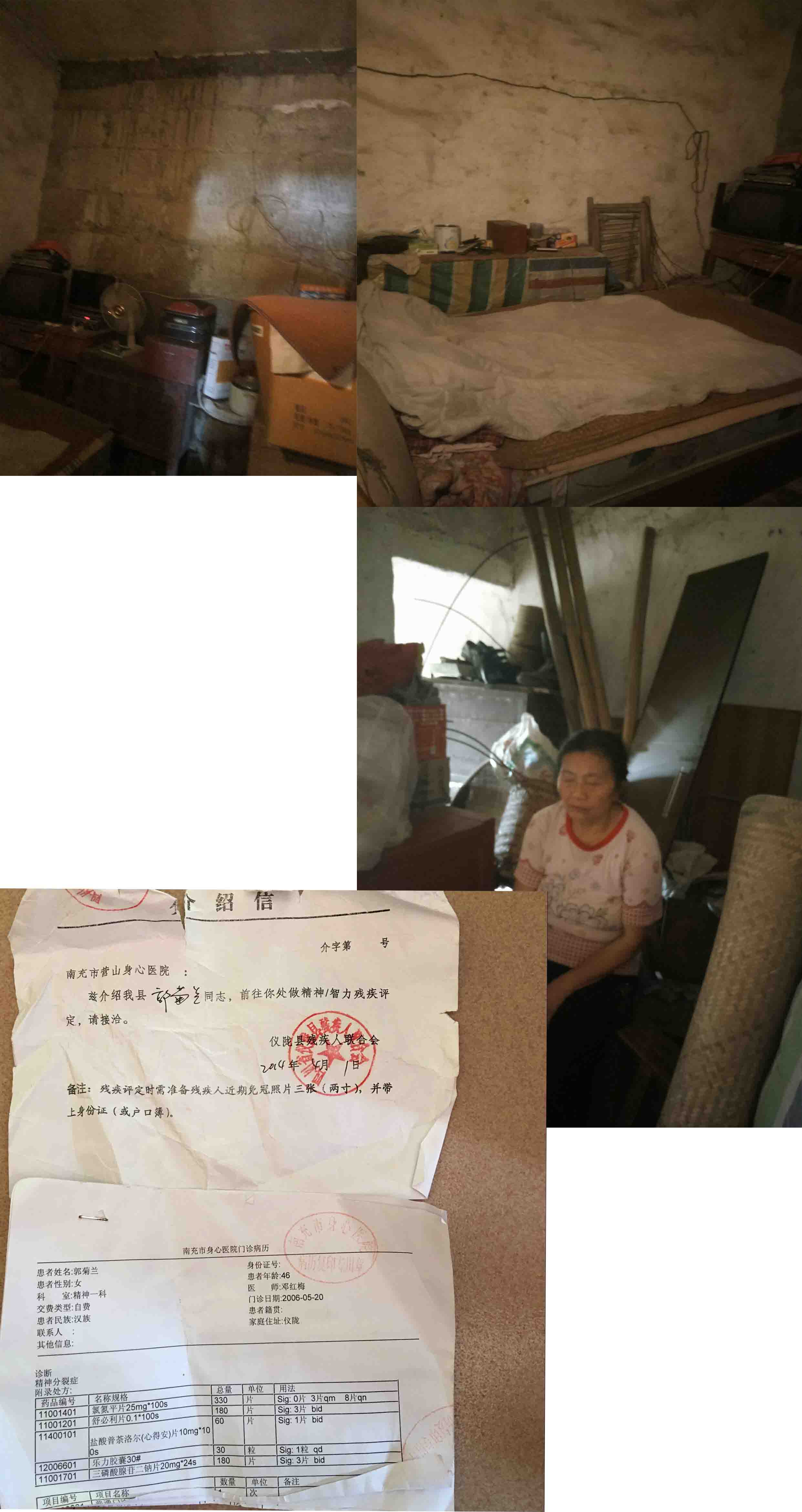 仪陇县大寅镇柏杨村七社,郭菊兰身份证51292719540202662X患有精神分裂症不定期反复发作,因医治花光积蓄,当家男人,以下苦力搬运维持生计,沉重的医药费以让家残破不堪。现住房屋年久失修,也成危房,遇到下雨吹风房子漏水严重。现因国家扶贫补助款项,然而村上名字落实。却到了宣布的时候 就没有了 ,村上有车有房的却有名字 。因郭菊兰一听到人家这么好的条件都有名额,一气精神病再次复发。我家什么 都没有,还享受不了扶贫,望相关部门调查事实真相,为真正贫困家庭解决。上专图真实可靠望好心人 政府核实。