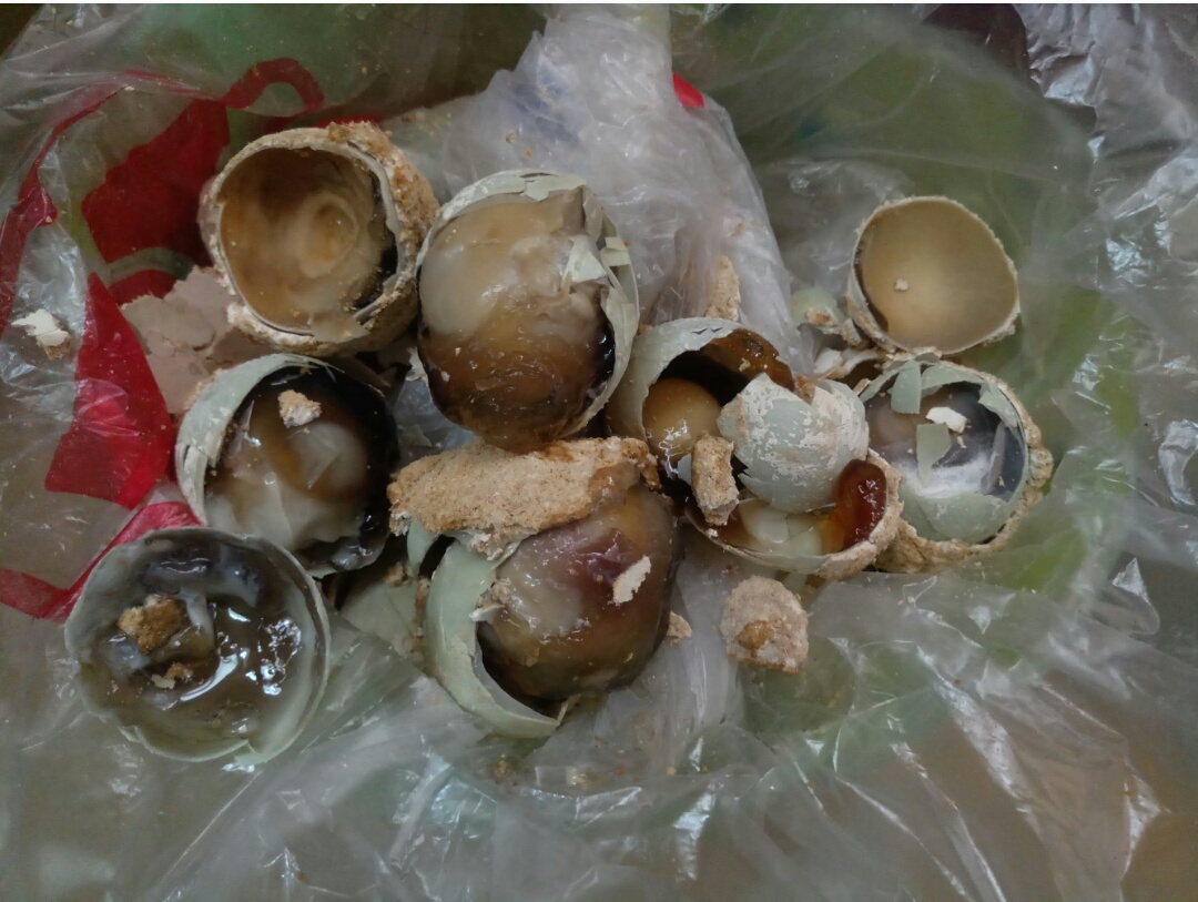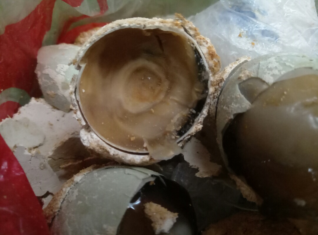 今天下雨没去买菜,想起6月12日在超市买的皮蛋,就准备剥两个下饭,没想到敲开后全是熏人的臭味,流出黏黏的液体。