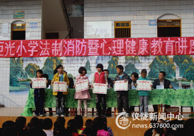 讲座中,仪陇县炬光派出所王警官就当今中小学生存在的法制安全误区、交通、网络安全等方面作了精辟的阐述,针对青少年儿童容易犯错的行为,通过列举案例进行分析、讲解,使学生正确理解依法行事、遵纪守法的必要性和重要性,提高自身的法制安全意识。随后,由经过专业培训的心理教师吴岚老师为农村留守儿童进行了心理健康教育,从心理学背景出发,以中小学生身心发展特点为依据,结合真实案例,让学生们了解到什么是心理健康、心理健康的重要意义以及如何维护心理健康等知识,提高身心健康意识,给师生添加了珍贵的“保护衣”,为创建和谐校园提供了坚实的思想保障。接着政教办刘毅同志结合第20个全国消防日,讲解了消防安全常识,现场教大家如何使用干粉灭火器扑灭火灾,并宣布了法制消防安全手抄报获奖班级。最后何习勇校长解读了《学生伤害事故处理办法》并对本次活动作了总结。